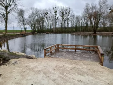 Installation des pontons d'observation sur le pourtour de l'étang et mise en place du mobilier urbain (bancs et tables de pique-nique).