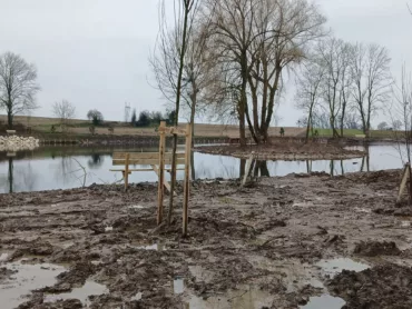 Plantation des hélophytes, arbustes et arbres sur l'îlot central et sur les abords de l'étang.
