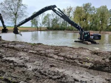 Curage de l'étang par l'entreprise WIAME TP afin d'enlever la vase accumulée au fond des étangs. La qualité des eaux sera améliorée et le volume de stockage du bassin en sera agrandi.